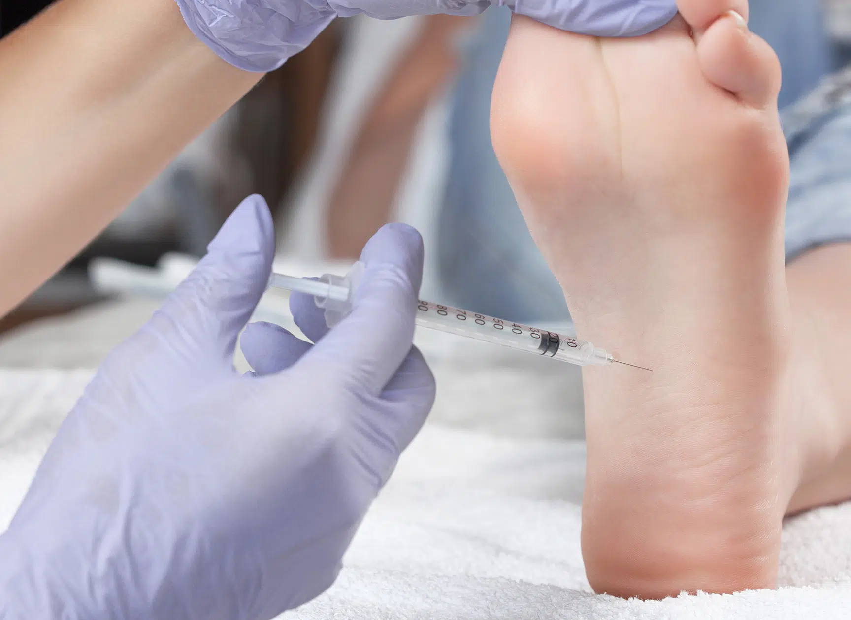 Compte tenu de la sensibilité de la plante des pieds, le médecin réalise une anesthésie locale, par injection de lidocaïne. Le produit anesthésique est aussi présent dans l’acide hyaluronique injecté pour le confort d’injection.